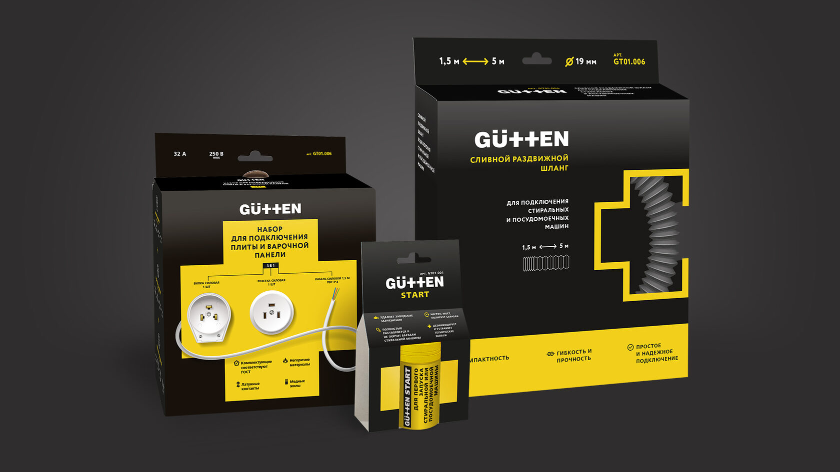Gutten — новая линейка аксессуаров для установки и последующей эксплуатации бытовой техники. Производство сосредоточено в России и странах Евросоюза, а нейминг, логотип, фирменный стиль и брендбук разработаны в Уфе — в нашем агентстве Marten marketing.